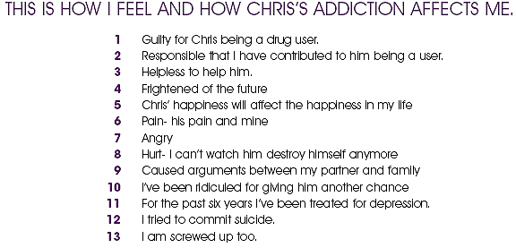 whatever went missing or make excuses. As Chriss life went down the black road of drugs, so did mine. Two years ago, I was working inWigan, when I received phone call from Chris. He told me that two thugs who lived nearby had slashed his face. On the way home, I tried to prepare myself for what I would see. Chriss face had been slashed twice. His cheek was hanging off! I dressed his face and took him to Whiston hospital. We sat there in silence for four hours. A junior doctor attempted to restructure his face. Chris was in agony and she evidently wasnt doing a good job so I asked for someone senior to look at him. With each attempt to stitch him, I felt the pain and felt guilty and helpless but I knew I had to stay in control for Chris sake and my own. He needed to have surgery the following morning but Chris couldnt stay in overnight because he needed a fix. I had to take him home to get a fix and then take him back to the hospital. I was so angry with him and the people who had done this to him. Chris came back home and continued to take his drugs. Those responsible made it clear they hadnt finished with him and when they saw my other son, they beat him up too. We were helpless to do anything for repercussions from these thugs on our families. I rang the person who slashed him and he demanded money and told me that he hadnt finished with him. He was calling my son a low life. I went to the police fearing for Chris life and our own. The police told me to get Chris out of our town but Chris didnt want to go. The police advised me to leave here as these people would carry out their threats and until someone was brave enough to make a statement that was my only option. I couldnt leave my home, I stayed - Chris continued to take his drugs and me and my partner were almost at the point of breaking up. was so distressed and frightened that these people would kill my son. My partner and I continually argued, he wanted Chris to leave because he was frightened these thugs would come to our door. Chris drug life had really affected our lives. I didnt know people like this existed and I didnt realize how powerless I was. The police couldnt help although they knew exactly what was going on. I came to an all time low several weeks later when a neighbour said Chris had been accused of robbing a house and people were coming to my house with baseball bats to get him. I was terrified. Everybody hated Chris for what he was doing to our lives and I was terrified they were going to kill him. I didnt know what to do. I couldnt challenge these people, and I didnt want them to hurt my lad. I couldnt take anymore and the only way to get rid of the pain was to end my life. In desperation I took and overdose of tablets but a friend informed my partner of how low I was and I was taken to hospital. The following day I was still desperate, I had to go and see a psychiatrist and he said I wasnt insane I was just in an awful situation but there was nothing they could do to help me. I was ashamed because I work for the local hospital and if people knew what I had done, I would not be respected in my job. From the age of fifteen Chris was a very challenging teenager and being our first child we made lots of mistakes. If Chris stole anything, I would deprive him of something he had. For example he was involved with stealing a car stereo and it was Christmas time. We bought him a stereo for Christmas and I took it back to the shop to teach him a lesson. He was continually getting into mischief and we were losing control and my marriage was in difficulty. I threw Chris out at fifteen hoping he would go away for a few days and come back and behave himself. He didnt and when he did want to come back his father wouldnt let him.. I put Chris into care to try and help us get his and our families lives back, but it made things worse. The point I am trying to make is, I was always the person who had to tell Chris to go whether it be Chriss fault or ours. Which brings me to a time when I had met a new partner and we had saved to go on holiday. Chris was living with us but up to his tricks - lying, things going missing and living in his room taking drugs oblivious to my relationship breaking down. My partner was worried that when we went away, Chriss druggie friends would be in the house and lots of things would go missing. I told Chris he couldnt stay in the house whilst we were away and I told him to stay with his druggie friends but he said he couldnt. In desperation Chris and I went to the local hospital and asked them to admit him because he needed help. They couldnt. They didnt have the facilities to care for drug users. We drove home in silence. I didnt know what to do! I was heart broken. I wanted Chris to stay in the house but my partner was adamant that our home would be wrecked. As I was getting out of the car, Chris grabbed my handbag and took some of my holiday money. We were struggling in the street and then he ran off. My daughter saw what had happened and ran after him. She retrieved some of the money. I went away on holiday feeling awful. My partner was even angrier with Chris and I was angry and worried about him. I rang home every night to find out if my daughter had seen him. She told me he had got into the house and she and her brother had found him behind the toilet door with a strap around his arm and unconscious. She called the ambulance but Chris refused to go. My holiday was ruined! I didnt know whether I wanted to go home because I didnt know what I was going to do for Chris. He would be homeless again but he had upset my partner. It was terrible continually being torn and not knowing what to do! Chris wasnt living with me and I went to my daughters house. There was a knock on the door and I didnt recognise the person who was standing in front of me. His face was all distorted, unrecognisable and he was thin and scruffy. It was my son. He had an infection in his mouth, his eyes were swollen and he looked