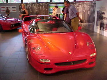 The Galleria Ferrari contains a large and comprehensive collection of Ferrari cars, components and memorabilia. Cars range from the 125, the first Ferrari built, through a large selection of road and track models up to the fabulous and rare F50 roadcar and last seasons F1 cars. As well as complete cars there are engines, gearboxes and other parts including a prototype desmodromic cylinder head. A reconstruction of Enzo Ferrari's office is amongst the other items on display, as well as a selection of the trophies the company has won over the years. The gift-shop sells everything that the Ferrari fan could wish for including used parts (such as valves and pistons) from the race cars. Still that's enought from me, I'll let the pictures do the talking. |