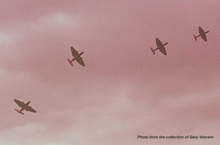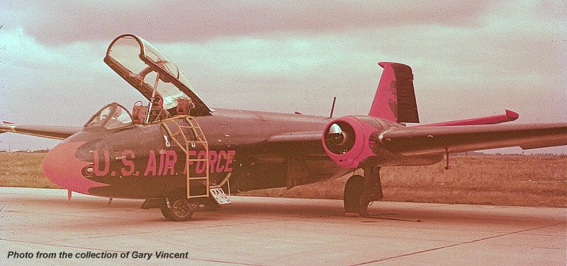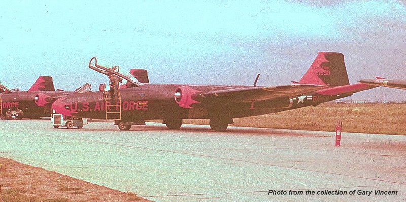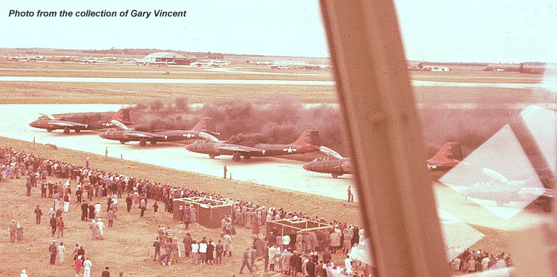 Extremely rare, never-before-published photos of the world's first jet bomber team ! Formed in 1956, the Black Knights were a team of Martin B-57's from the 38th Tactical Bombardment Group based at Laon, France. These unique archive photos were recently discovered by one of our Canadian SIG members, Gary Vincent, who has made them available for us to publish on our website. The four never-before-seen images of the team in action were scanned from original transparancies now in Gary's possession, but sadly the date and location of the photos and the name of the actual photographer are not known. Please note also that due to their age, the original slides exhibited strange colour shifts and were also rather scratched - because of this, the scanned images shown here have been "touched up" in an attempt to remove some of the scratching and improve the colour renditions to a more realistic level. For more information about this team, see http://www.b-57canberra.org/labs.htm Clicking on any of these pictures will show a much larger, higher resolution version. Photos must not be reproduced without permission