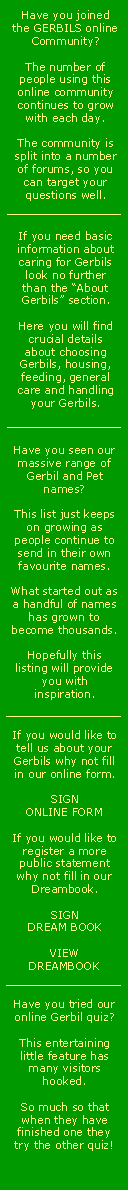 Have you ever wondered what it feels like to scamper around a Gerbil enclosure? Or may be look at things from a Gerbils eye view? Well with the "Gerbils Virtual Enclosure" section, you can jump right into a Gerbil enclosure and experience first hand what these things feel like and much more besides.