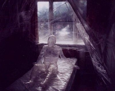 Cocoon 01 (1999) Installation: clingfilm, sellotape, string, bed, sink, desk, armchair, desk fan. Installed for 2 weeks in Dyfed Hall of Residence, Swansea Institute June 1999.