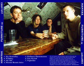 In the summer of 2001 I designed the layout and graphics for Gloucestershire band Hamyak's first EP 'Furniture'. Based on the theme of furniture I combined digitally manipulated sketches and the bands self-designed logo with some excellent photographs of the band playing live by fellow Cult of the Artist founder Andrew Ward to make a spoof furniture catalogue.