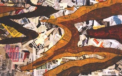 Oils and charcoal on newspaper collage.