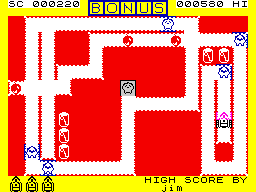![]() HARD CHEESE DK'Troniks / £5.95 This one is an arcade game where you have to eat your way through a maze avoiding the deadly bulldogs and zapping them with the deadly virus. Extra points can be gained if you're at all adept at handling cherries! Brian This is not a new concept, but it's very playable and quite fast - if anything a bit too fast. Unfortunately, there's nothing other than loading instructions on the sleeve. 7/10 Ieuan It's a good game, with enjoyable sound that doesn't slow things down at all. A joystick is handy for games of this speed; a very, very addictive game. 9/10 Dilwyn Player keys in this game can be re-defined, which seems to be the ultimate answer to joystick compatibility. When you enter in the high score name, letter descenders disappear! 8/10 |