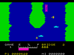 for the Atari. You have to guide a jet plane up a river, banked on both sides by steep cliffs, shooting enemy planes, helicopters, ships and missiles that get in your way. Refuelling posts appear every now and then but these get fewer and further apart as you progress through the levels. The graphics are quite smooth, but their quality's not so wonderful when you really push your foot down (or whatever you do in planes) - migraine sufferers watch out. Having said that though, you hardly need the graphics quality of Sabre Wulf to produce a good game, and River Raid's certainly a good, addictive game. The game's both colourful and attractive to look at, and includes a good |