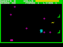 afraid. Your task is to collect sweets and chocolate rolls from around the screen, which itself consists of very unexciting graphics; the vacuum cleaners are very shabbily defined and the mice, etc, are such grim programming specimens as to be almost unrecognisable. Moving your character square around the screen, you move into stationary and moving blobs, whilst avoiding others. The only difficult thing is getting out of the way of the baddies - difficult only because they go from side to side at silly speeds. At first the game seems quite tricky, but soon becomes simplistic. I was looking forward to seeing some screen variations but I was |