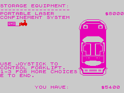 This vehicle's cheap, but it only carries five items and chugs along at a mere 75mph. It's not really that good a buy as it won't hold all the items you can afford to purchase and it's so slow that you'll be reaching for those abort keys quicker than you can say 'Gremlins'. Of all the monitoring equipment on offer, the Image Intensifier is the most useful, allowing you to keep a constant watch out for those Slimers.