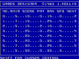 | Use the Anim column to define the alien animation. Just like the sprite designer, you'll need to have the manual close to hand if you're going to make head or tail of these numbers. |