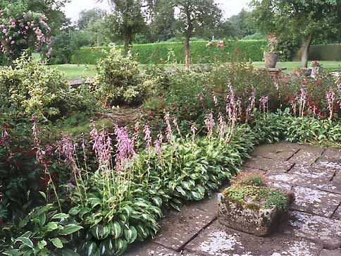 Wardington Manor Gardens Picture 7 The sunk border on the west side of the house with the orchard on the background. Hostas in flower surround hardy fuschias and on the wall we see Euonimus Silver Queen; photographed in August.