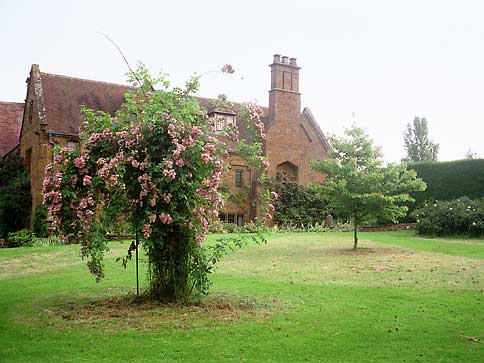 Wardington Manor Gardens Picture 21 An old pink climbing rose which originally rambled over an apple tree. The brown patches are where the daffodils have been mown.