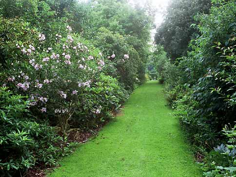 Wardington Manor Gardens Picture 31 Looking up the pond walk in late July; pink lavateria Barnsley on the left.