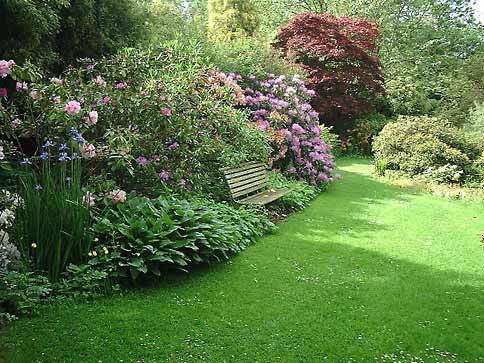 Wardington Manor Gardens Picture 32 A seat among the rhododendrons, looking towards the pond. Japanese irises stand well against rhododendron Pink Pearl. Photographed in late May.