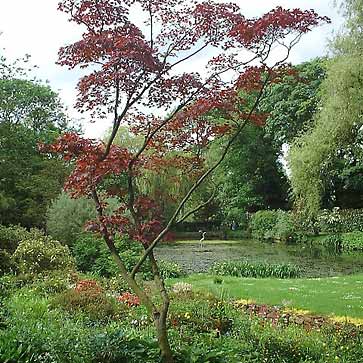 Wardington Manor Gardens Picture 33 A view across the rock garden to the pond with a japanese maple in the foreground, Photographed in May.
