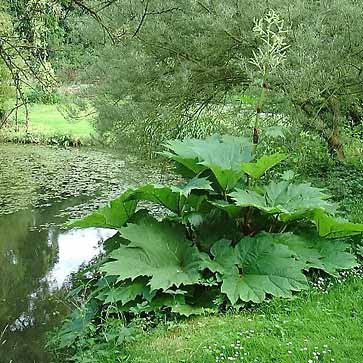 Wardington Manor Gardens Picture 37 Rheum palmatum in full flower standing on the side of the pond photographed in May.