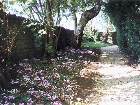 Wardington Manor Gardens Picture 40 A path at the end of the orchard we call the Church Walk, carpeted with cyclamen neopolitarum in October.