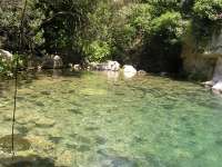 There are three possible approaches: one from the town of Sortino to the north west (they originally planned for the road to span the gorge and continue to Ferlà!) which entails a long and fairly gentle descent to the floor of the canyon (the river here is the Calcinara, which joins the Anapo a few hundred metres downstream) - there's a beautiful clear pool at the bottom [see below], in which it's possible (just) to swim. From there there is a long steady climb with fabulous views down to the Calcinara until you meet the Ferlà section of the road. An alternative is to take a steep path down from where the road out of Sortino comes to an end; this goes straight to the valley floor, where you can cross the Anapo by stepping stones, and join the old railway track. Or better, you can keep beside the river for the time being, and pass the confluence with the Calcinara - this is the wildest and most beautiful part of the gorge.