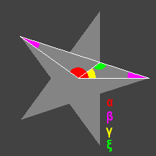 The angle gamma, shown as γ, is 2π divided by twice the number of star points. In this example gamma is π/5 which is 36 degrees, since 36 = 360/(2 * 5).