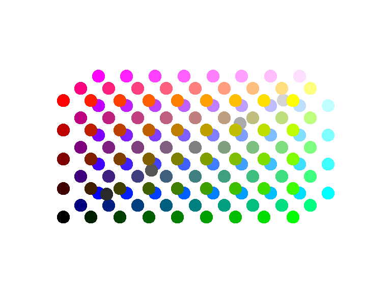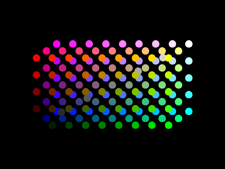 Discs in 139 colours on a black background. As one of the discs is also black, the black disc cannot be observed. |