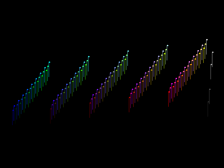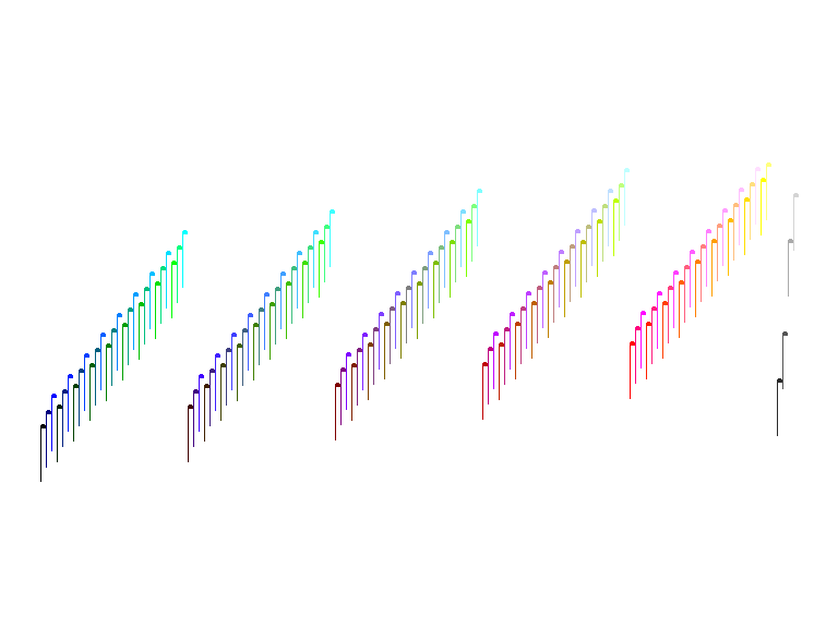 | Musical notes in 139 colours on a black background. As one of the notes is also black, the black note cannot be observed.