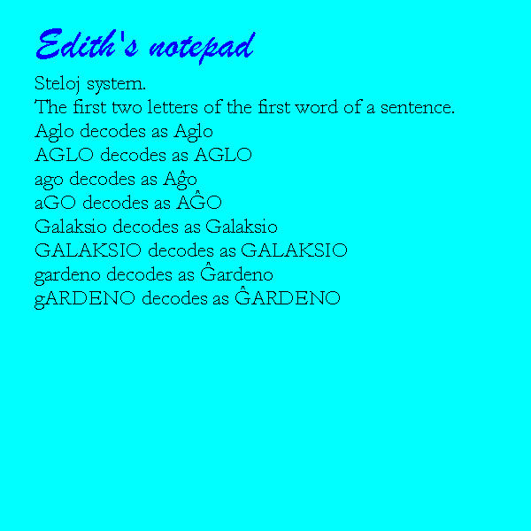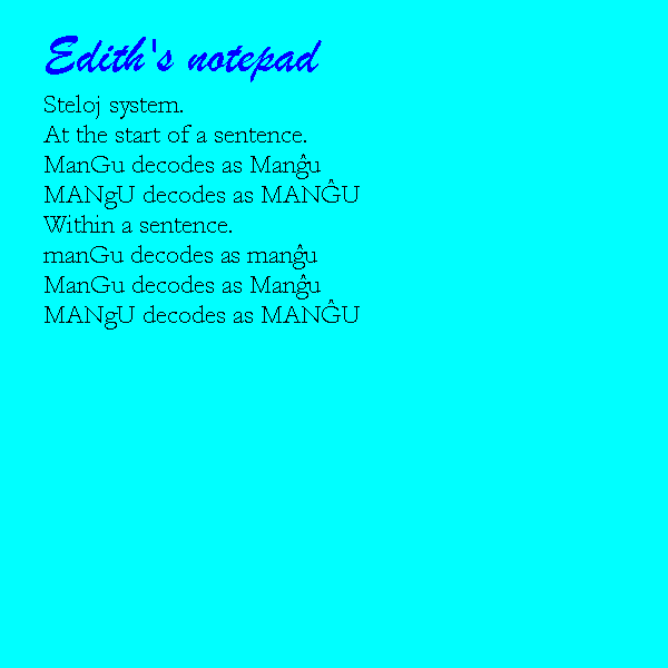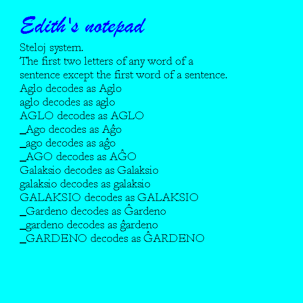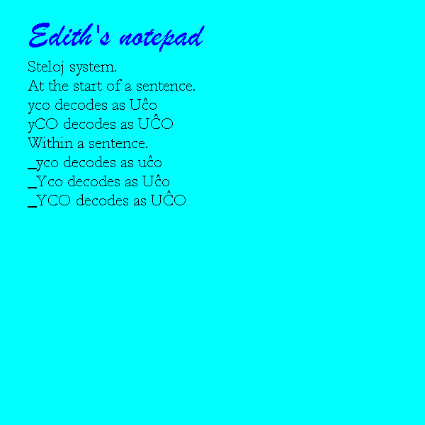 "The practical problem of defending the steloj system lest a software unicorn cause havoc, is that the fourth rule gently modifies the first two rules to add that where a word begins with an unaccented letter u followed by an accented letter, then the letter u is expressed in the machine readable steloj code by a letter y and that in decoding, the y is decoded as an unaccented letter u and the accenting effect is passed onto the second letter. This is a very strong defence against the three letter word spelt u, c circumflex, o causing havoc if it were to be expressed in the steloj system."