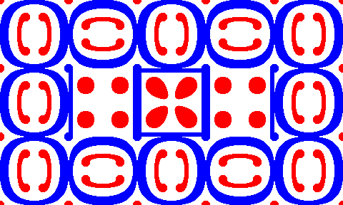 It was produced by typing letter p and space alternately along rows in 72 point using the Parabola font in the Paint program: for this graphic, three uses of the letter p were used. A copy was made, the colour of the copy was changed and then, after a location point 48 pixels in each direction from the lower left corner of one of the individual motifs had been drawn in temporarily by drawing two rules, each rule 48 pixels long, at right angles to each other, the copy was pasted over the original at 8x magnification. Copies of the 48 pixel rules were then used so as to locate the boundaries of the graphic for accurate trimming at 8x magnification. In the above, various copies of the original 48 pixel rule were used, some rotated through 90 degrees, thus there were horizontal rules and vertical rules used in making the graphic. The various rules were then coloured in using the background colour, white, so that they disappeared from the image.