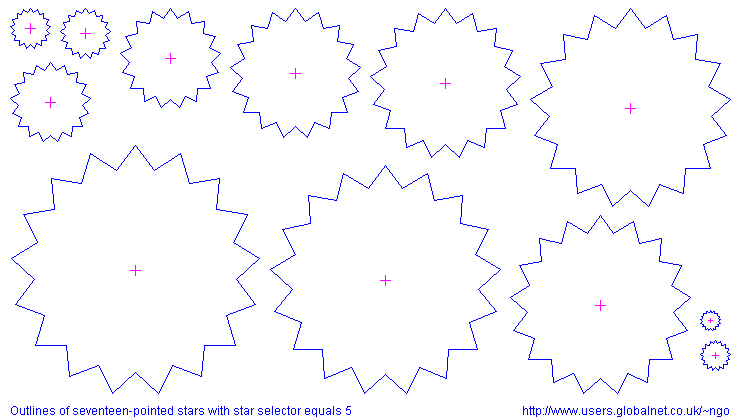 Seventeen-pointed stars in various sizes, star selector equals 5.