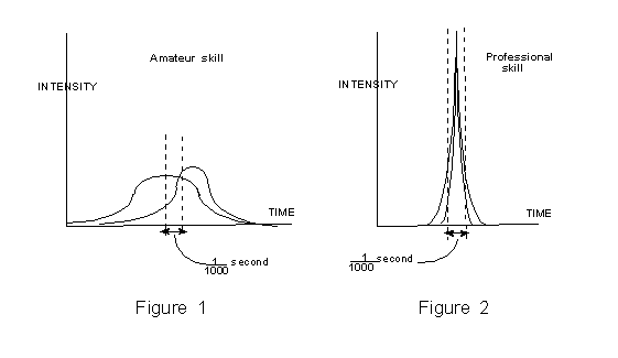 Figure 1 is a graph of intensity of muscular force/quantum action against time and shows the condition in just two joints (any) for a non-expert level of ability. Normally there would be a distribution curve for each joint in question; we are only showing two. The waves represent impulses which as one can see not only are poorly synchronised but are spread out in time. This means muscular tensions are operating to keep the joints from collapsing since the information density in the learning patterns is low and the quantum computer system cannot provide a sharp focus of the energy during the one-thousandth of a second.