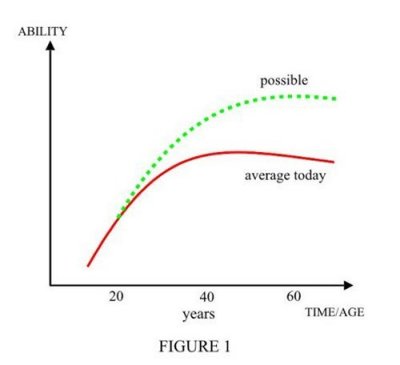 Firstly, let us begin by clarifying a confusionin fact hidden assumptionin which we tend to identify time with age when we are talking about certain abilities. To the degree the ability involves physiological activity, then time is equivalent to age; meaning that physiology, such as involved in muscular activity, deteriorates with time/age. This is inevitable in a carbon body, such as ours, and a DNA with a gene condition that allows this deterioration which we mildly call aging'. Not all time is age-related. See Figure 1.