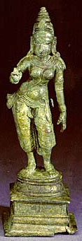 This portrait of the goddess Parvati as little more than an appendage of her husband belies the true nature of her character. Her name (Parvati means "daughter of the mountain"), derives from her origin as the child of King Himalaya. Semi-divine in nature, she first observes her future husband when he is engaged in deep aesthetic meditation (tapas). Siva is a renowned bachelor amongst the gods. He is wild figure, a womaniser, and an ardent aesthetic who spends vast world-spanning periods in meditation from which he cannot be raised. Parvati, having taken a fancy to the unsuspecting Siva, tries at first to tempt him out of his meditation with her feminine charms. Having failed to move him from his trance, she vows to outdo him in meditation to gain his attention. She sits before him and meditates so deeply that finally Siva stirs, recognises her beauty and strength, and falls madly in love with her.