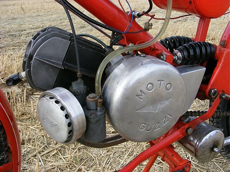 Moto-Guzzi manufactured the 65cc Motoleggera 'Guzzino' 1946 - 1954, when it became remodelled into the 65cc Cardellino 1954 - 1956. Engine capacity was increased for the 73cc Cardellino 1956 - 62, then the 83cc Cardellino 1962 - 65. Over this period the cycle chassis evolved with a modified frame to friction damped rear suspension, telescopic fork set, full-width hubs, different mudguards and petrol tank. The form of the engine however remained basically unchanged.