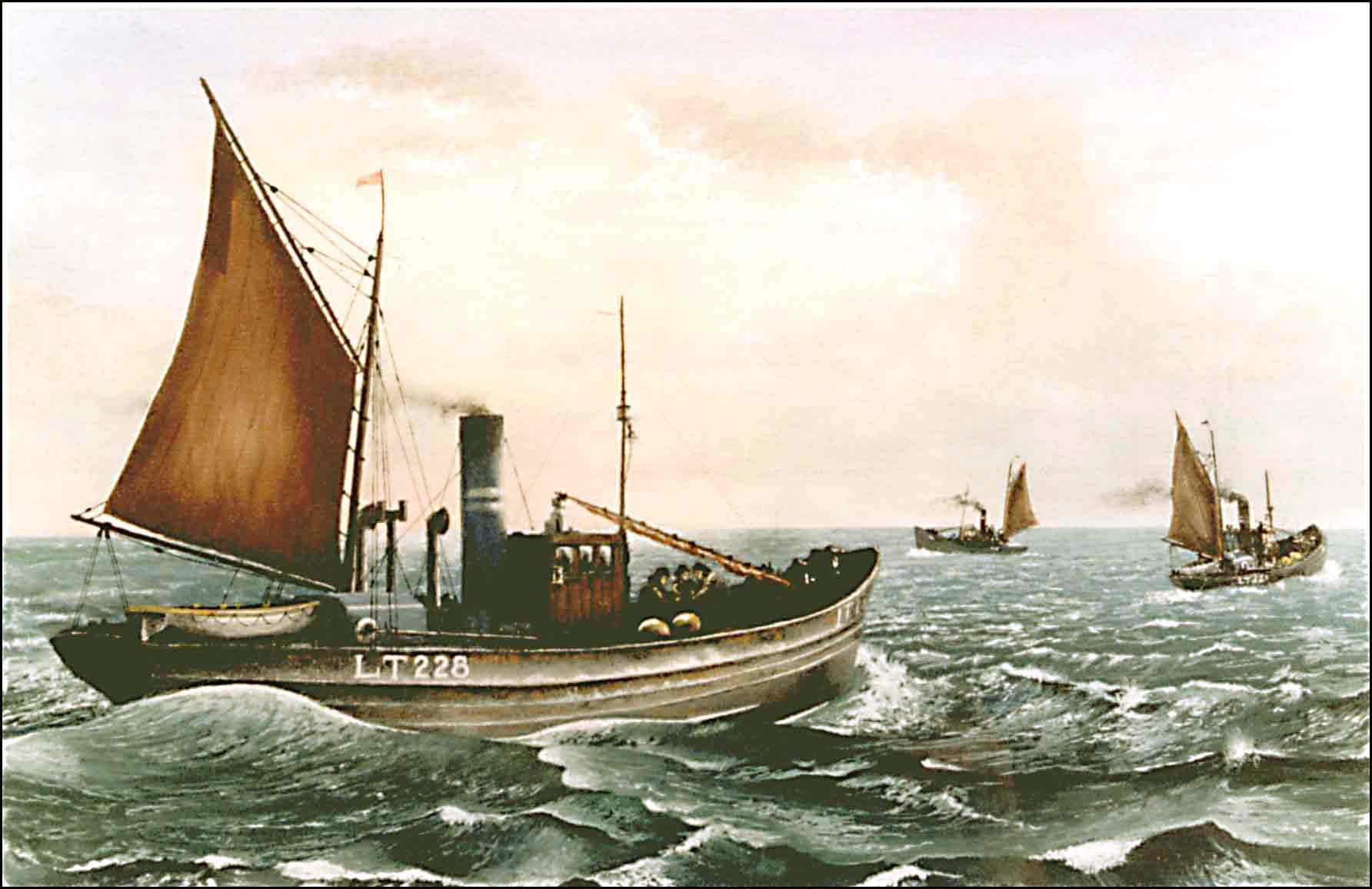 A simple picture depicting what used to be the daily scene off the Norfolk coast - pre-war steam trawlers setting out into the North Sea from the port of Lowestoft. The loss rate of these tiny boats was enormous. All-steel construction, with practically no buoyancy, made this type of fishing a most hazardous occupation. I doubt whether the regular consumers of lunchtime fish and chips ever gave much thought as to how dangerous it had been for someone to secure this particular delicacy for them. Fish may be free, but the sea does not give them up easily.