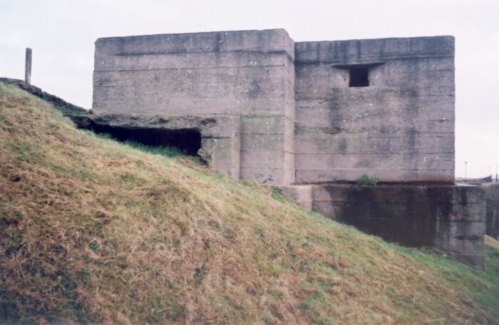 Type F/W23 positioned on a railway embankment. This is the pill-box featured in the first photograph on this page. The concrete block to the left of the loop-holed section contained the LAA gun.