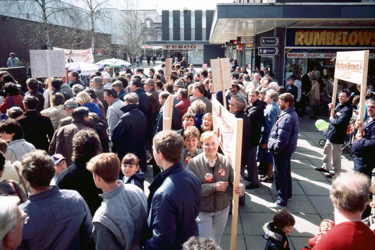 Crowds of Matthew Brown supporters congregate in St. John's Precinct to listen to a hell-raising speech by Dale Campbell-Savours, Labour MP for Workington. Note the shop names, which changed quite a bit between 1985 and demolition day.