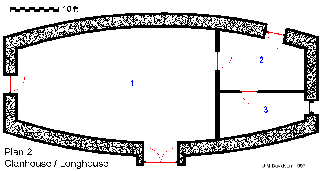 A thick walled longhouse, roughly 60 x 24 ft internally, divided into one large chamber and two smaller rooms. This sort of structure normality had stone or stone and turf walls and thatch or turf roof. The innkeep's clan would normally have accommodation in a neighbouring house. If this building has a cellar it is likely to be a small wooden chamber under the center of the hall.