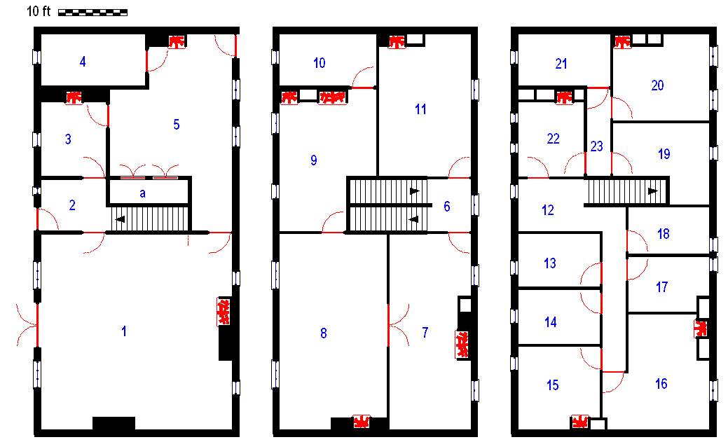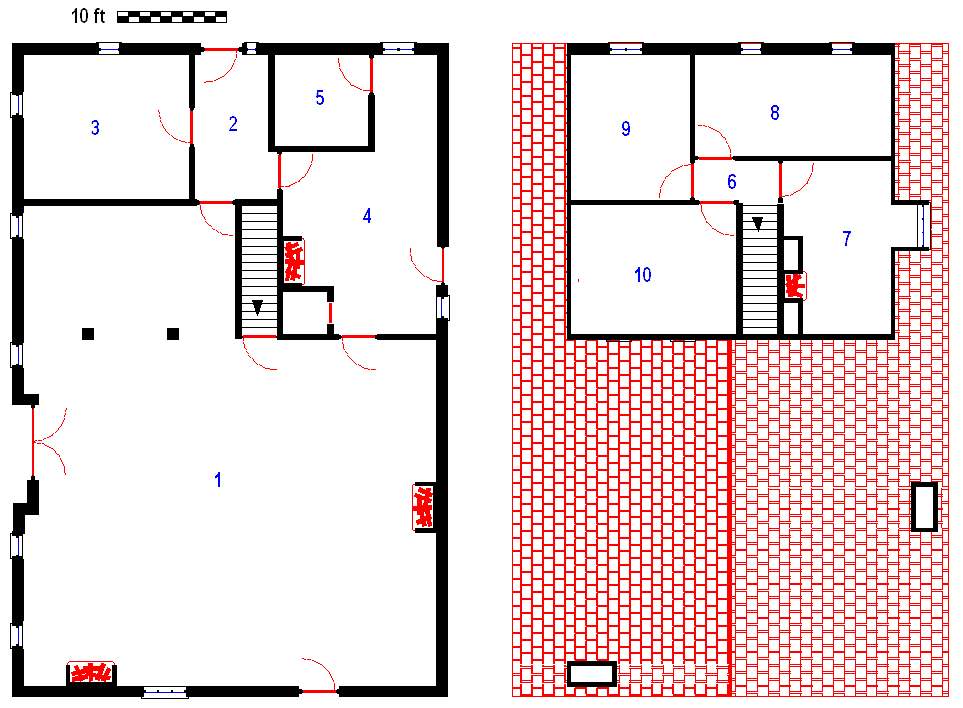 Note these plans are outline, and do not have doors and windows drawn, nor are they furnished. Room function is also not indicated to allow the greatest flexibility in your description. Normally the largest room will be the common room (bar). Cellars can be added to all the plans, just indicate in the description where the trap door is.