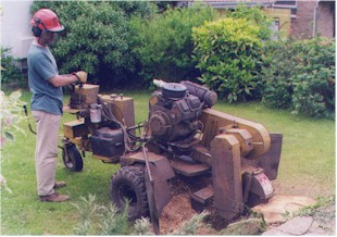 The machine consists basically of a cutting head driven at very high speeds by a petrol or diesel engine. The cutting head sweeps from side to side as it cuts and the whole machine is pushed forwards between sweeps to maintain the cutting process. Once a slice has been removed from the stump the cutting head is lowered and the procedure repeated. The cutting teeth are designed to cut and pulverise wood, soil and small stones into a wood chip mixture which can be composted and used as a garden mulch.