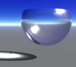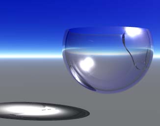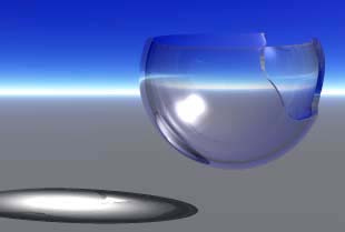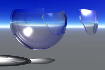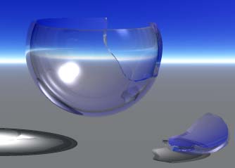 The rock should have the same glass material applied as the bowl. With the rock selected, click on the A button and select negative. Group the glass rock with the bowl group. The resultant render is shown to the left. Attach a glass cylinder for a stem and make a base from a flattened sphere with the bottom cut off by subtracting a cube. There you have your broken glass.