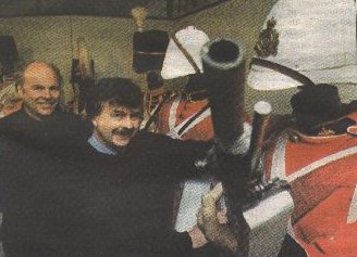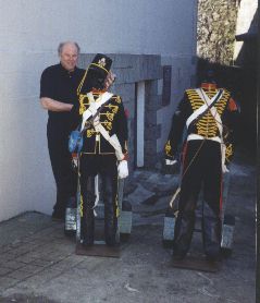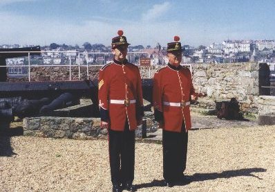 The high speed Condor ferry approaching the entrance to St Peter Port harbour The next morning, an early start was made and one by one all the dummies and their accoutrements were carried up the steep paths and stone steps leading to the terrace containing the old 18th century Hospital building. which was to contain the exhibition From this level the views over the harbour and town were breath-taking but not as breath-taking as the climb up to that level whilst carrying a full-size dummy! After working all day Saturday and Sunday morning, we eventually stood back and felt quite proud of the overall result of our labours. The museum's technical support department had produced some superb signage to accompany the exhibition and the whole effect was very pleasing. Always on the lookout for an opportunity to wear my 1895 Royal Welsh Fusilier major's uniform, I had been invited to take part in the noon gun firing ceremony. This takes place precisely at noon each day, and is performed by Castle attendants wearing replica uniforms of the Guernsey Militia which were coincidentally supplied by Thin Red Line! After some quick discussion, a scenario was agreed, and I became Inspecting Officer of the Firing Party for the day. This was great fun and seemed to go down very well with our audience of Castle visitors, so much so that we repeated the performance the next day (Mayday)