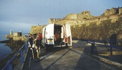 Some of the assembled troops ready for embarkation and awaiting transport The hitherto empty white van was loaded with the troops without too much ceremony, some having helmets or other equipment removed for ease of access, and was driven to the nearby ferry terminal at Poole. Brian Owen now had the human (some say)company of Keith Perks for the return journey to Guernsey. After a very painless and very high speed crossing taking only just ove r two hours in the amazing Condor catamaran ferry, we berthed at St Peter Port and drove the short distance to Castle Cornet. For yours truly, this day had been the culmination of a week or so of very frantic activity preparing all the dummies after their off-season storage, and it came as rather a nasty surprise when Brian announced that we would have to unload our cargo that evening, and that their new home was situated high up inside the castle with no easy access. A compromise was reached and the troops were stored overnight inside the castle, but at ground level!