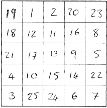 Ok, last time the competition was to fill in the 5×5 magic sqaure, such that each row, column and major diagonal adds up to 65. So all you had to do was to put the digits 1-25 in to this grid.