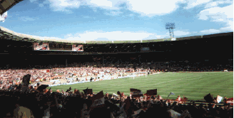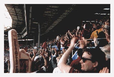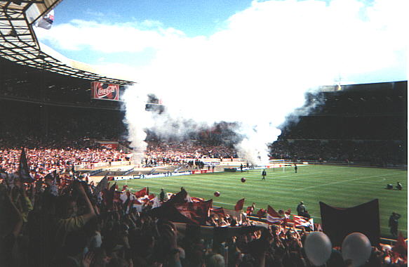 Before we knew it, it was half-time, didn't see any half-time entertainment, I spent the time queuing for the toilets!! The second half started with the Swans in the ascendancy and Cobblers were almost inviting them onto them, but Razor and Sammo never looked unduly troubled. I looked up at the stadium clock, 60 minutes gone, could we withstand this pressure, the Swans fans were getting louder and our own following had lapsed into silence. Things were not looking too good at this stage.. Atkins decided to replace Gayle with Jason White, I was surprised, I thought it would be Larry that would go off. The pressure eased, Jason started making a nuisance of himself and the Cobblers were getting back into it, the crowd sensed it and the chant "Cobblers, Cobblers" started ringing round the famous old stadium. Another Cobblers attack, Swansea were living on their nerves now, expecting and waiting for extra-time. A Cobblers attack down the left, half cleared, it fell to Lee, he moved across the edge of the box looking for an opening, a lunge from a Swansea defender gave Cobblers a free kick on the edge. The ref had problems getting the wall back, but finally did so to his satisfaction, the Stadium clock had been showing 90 minutes for at least two minutes. Frain stepped up and shot but straight into an onrushing Swansea defender. Oh well, extra time I thought. The ref however decided to penalise the encroachment and ordered the kick retaken. The wall retreated, no-one encroached this time as Frain ran in, then time stopped.... the ball went at about one mile an hour into the left hand side of the net - HE'D SCORED!!!!!!! 1-0 we were going to win!! The final whistle went during the continuing celebrations over the goal. The Swansea end was stunned, but at that moment I only had eyes for the boys in Claret. Fairy tale stuff, centenary year, first time ever at Wembley and we were winners!!