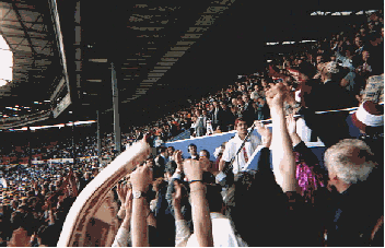 The anthems were sung, the Welsh anthem being roundly booed and whistled at, and no-one heard God Save The Queen until about the last two lines!! And so to the game, as Cobblers kicked off attacking the sparsely filled Swansea end of the ground, the Swans had the first meaningful attack, with Woody making a brilliant save from Heggs, but that was really the only scare the Cobblers had in the first half, and although allowing Molby space and time, it was a mistake from the fat Dane that almost gave the Cobblers the opening goal, he was dispossessed by Grayson who found himself in acres of space, and headed for goal, it was crying out for a Larry special but he slipped it out left to Parrish who beat the keeper only to see his goal bound shot cleared off the line. The Cobblers were soon to be denied the services of influential David Rennie, although I didn't see what happened to him. Dean Peer came on as Cobblers reverted to 4-4-2. Gayle was battling hard but Larry looked out of sorts. Christian Lee was showing one or two nice touches but the engine room of Parrish and Hunter were matching the Swans midfield tackle for tackle, only Molby stood out, and that as much to do with his size these days!!