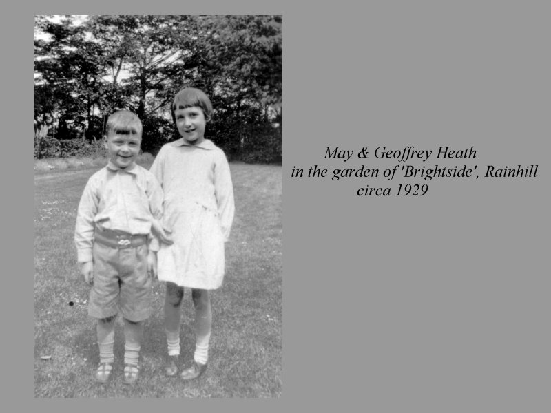 Until I was eight, my father’s parents lived at Rainhill, midway between Manchester and Liverpool. Grandfather Heath was a colliery agent, and his boast was that he had never been down a coal-mine! He and my grandmother lived in a big house with two servants Mr & Mrs Fogg who were the gardener and housekeeper respectively. We went to Rainhill every Christmas, and we must have gone in the summer, too, judging from a photograph of May and I on the lawn.