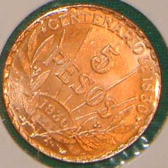 | 5 Pesos | 1930 | .2501oz pure gold Constitution Centennial Catalogue Value $175 | BU |