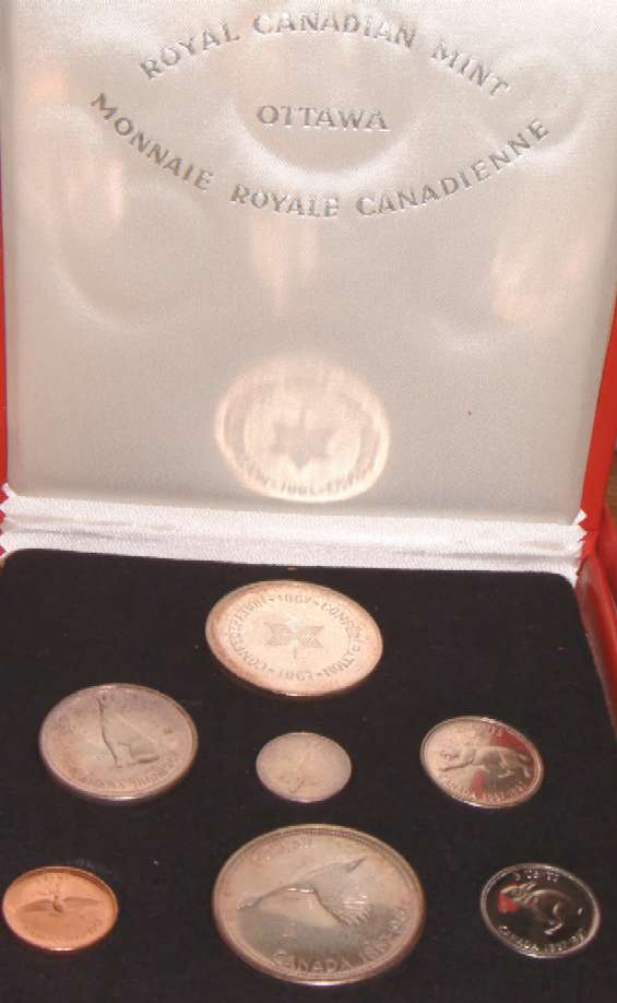 of Confederation Commemorative Set Silver Medal + $1 Silver,50 Cents silver,25 Cents silver,10 Cents silver,5 Cents,1 Cent. In Red Leather case/box of issue. (light toning) |