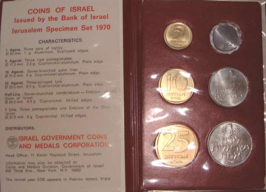 (specimen set). 1 Lira,½ Lira,25 Agorot,10 Agorot,5 Agorot,1 Agora. In Red wallet of issue. |