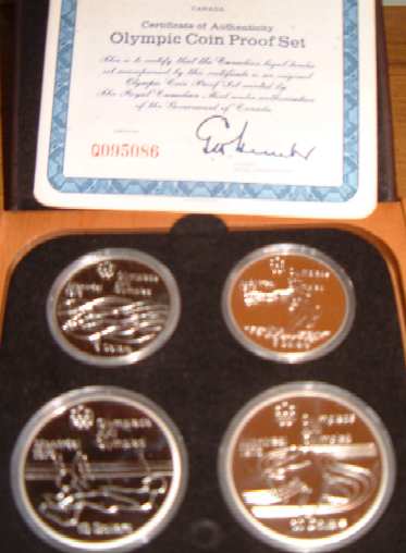 Set. Series IV (All coins .925 Solid Silver) $10 Men's Hurdles, $10 Women's Shot Put, $5 Marathon, $5 Women's Javelin. Over 4.33oz pure silver in this set (box Canadian White Birch Wood & Tanned Steer Hide Cover) |