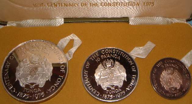 of the Constitution 20 Pa'Anga .999 silver weight 140gram 63mm dia only 800 minted, 10 Pa'Anga .999 silver 62gram 51mm dia only 420 minted, 5 Pa'Anga .999 silver 31gram 39mm dia only 418 minted. All in box of issued some toning purplish. Only 418 sets could of been issued (as krause states) but the 5 & 10 could be bought separately at the time so less than 418 sets available. A very seldom seen set and way under valued in catalogues. |