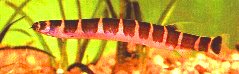The Kuhli Loach has an eel shaped, elongated body that is very slightly compressed at the sides. The fins of this fish are all small. The dorsal fin starts just after half way down the back and the anal fin is well behind this. The eyes are covered with a transparent skin and have a movable spine beneath them, there are four pairs of barbells and no lateral line is visible. T he entire body of the fish is covered with fifteen to twenty dark brow n to black vertical bars, the gaps between them range from a salmon pink in some species to a rich yellow in others. The underside is light. | |